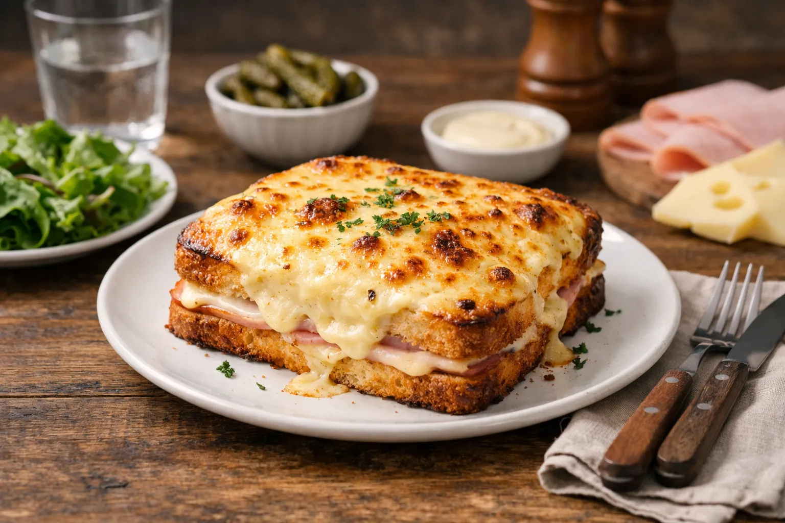 La béchamel apporte deux choses qu’un croque “simple” n’a pas : de l’onctuosité et un vrai gratin. Elle joue un rôle de “couvercle moelleux” qui protège le pain du dessèchement au four, tout en permettant au fromage de dorer joliment.