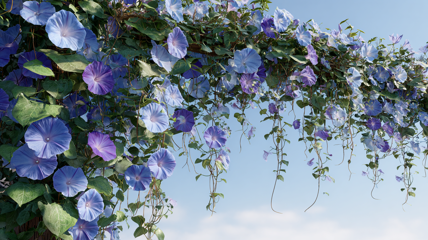 • Ipomoea tricolor ‘Heavenly Blue’ : Ses fleurs bleu azur en trompette s’ouvrent chaque matin. Grâce à sa croissance rapide (jusqu’à 3 mètres), elle grimpe murs ou treillis en un clin d’œil. Idéale pour un jardin de type cottage.