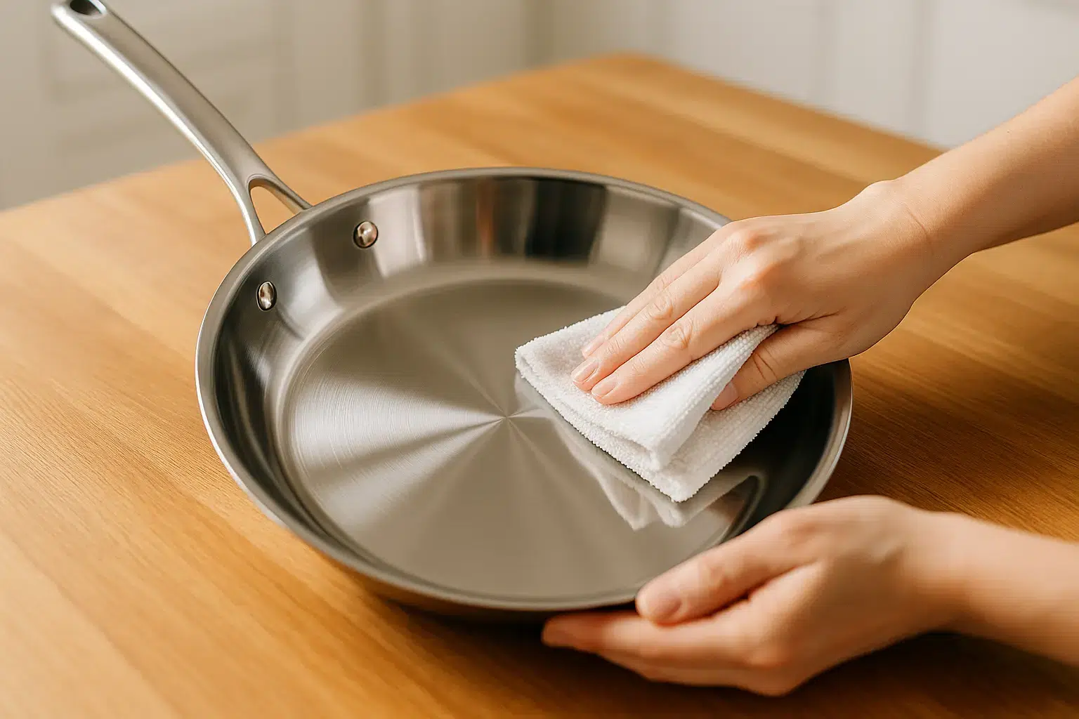 Ensuite, séchez immédiatement avec un linge propre. L’eau stagnante laisse des traces blanches, surtout si votre eau est calcaire. Un coup de chiffon sec, et la poêle brille comme neuve.