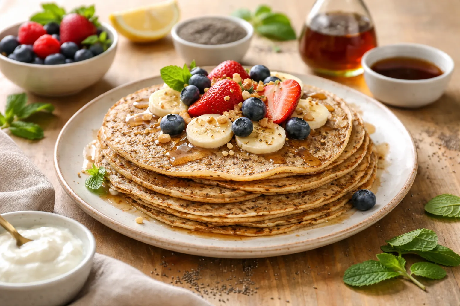 Ces crêpes véganes au chia et psyllium sont moelleuses, faciles, et elles se conservent super bien. Tu mélanges, tu laisses reposer, tu cuis comme des crêpes classiques. Et après… tu les garnis comme tu veux, sans prise de tête.