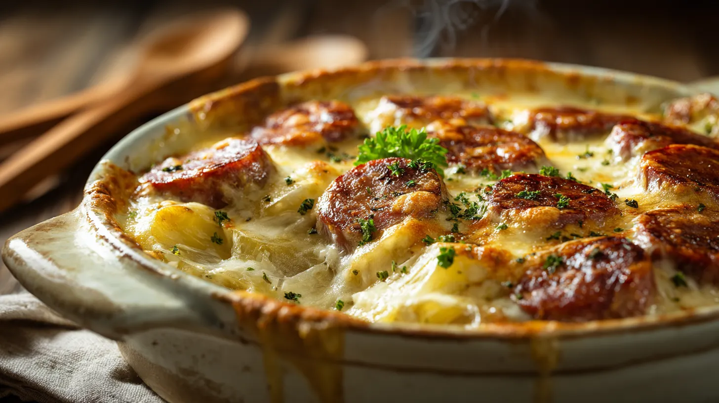 Servez chaud et savourez ce gratin savoureux qui associe la richesse des saucisses de Toulouse aux arômes des poireaux.
